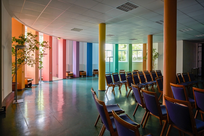 Der Raum wird dominiert durch zwei mal zwölf Säulen. Günter Steinmann hat diese Säulen 2011 zu einem 12 Ton- 12 Farbenraum gestaltet. Für größere Familienfeiern bietet der Raum ideale Voraussetzungen. Eine Küche und eine behindertengerechte Toilettenanlage sind ebenso vorhanden.